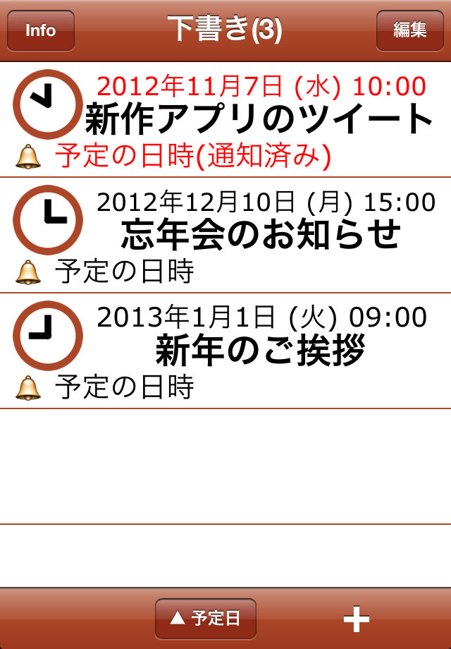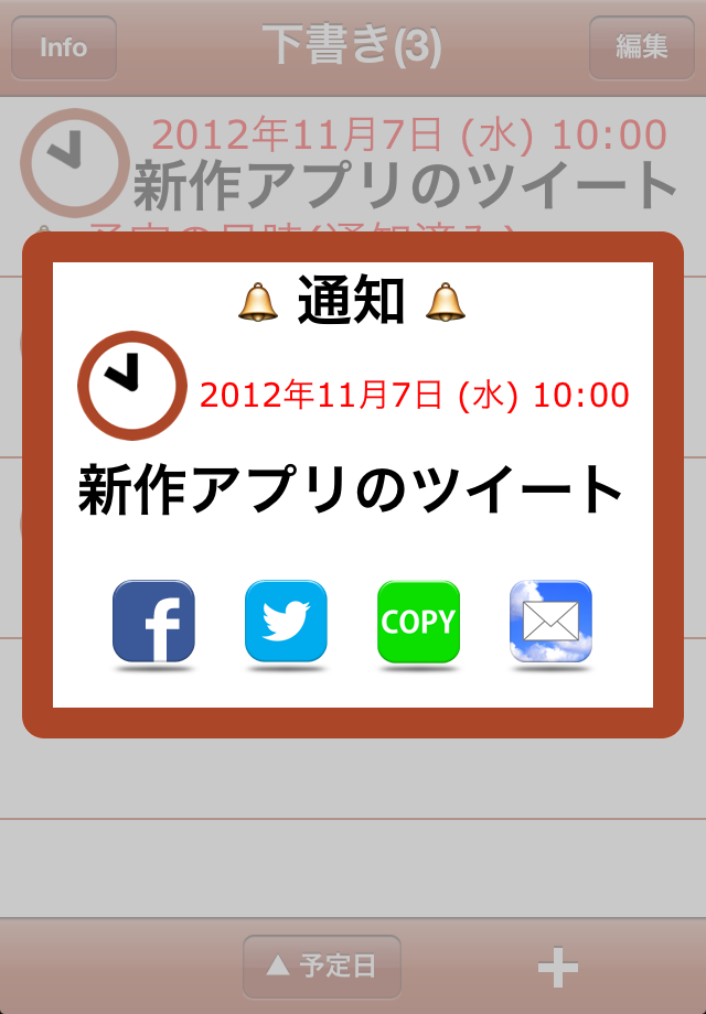 次の新アプリ「下書き通知」 2012/11/7 2012/12/4 Cocoamix情報 またまた新しいアプリを申請しました。 下書き通知 下書きを保存しておいて、送りたい日時に通知してくれるアプリです。 *自動ポストするアプリではないです。 通知を受信時、対象アプリを選択し送信します。 メール、ツイート、Facebook投稿用の下書き保持ツール といった感じです。 公開をお待ち下さい。
